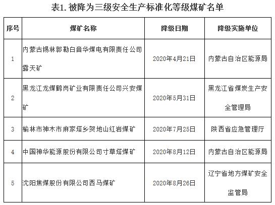 按照《煤礦安全生產(chǎn)標(biāo)準(zhǔn)化管理體系考核定級辦法(試行)》(煤安監(jiān)行管〔2020〕16號)有關(guān)規(guī)定,內(nèi)蒙古錫林郭勒白音華煤電有限責(zé)任公司露天礦等5處煤礦一級安全生產(chǎn)標(biāo)準(zhǔn)化等級被降為三級,詳見附表1。