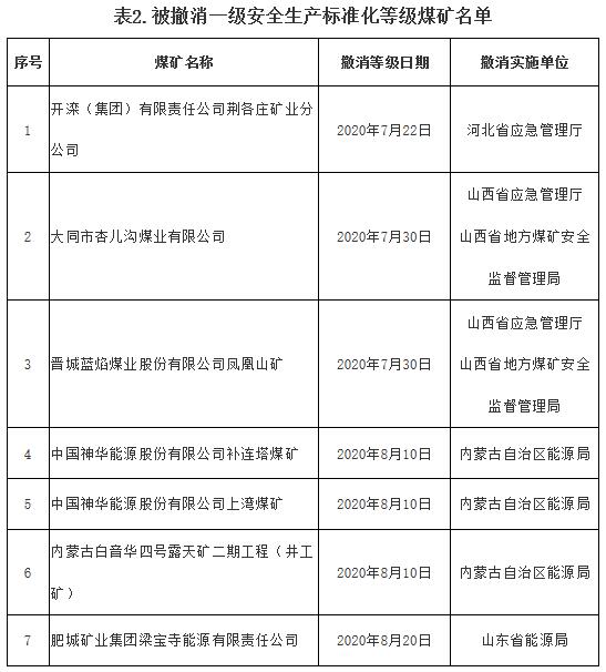 開灤(集團(tuán))有限責(zé)任公司荊各莊礦業(yè)分公司等7處煤礦一級安全生產(chǎn)標(biāo)準(zhǔn)化等級被撤消,詳見附表2。